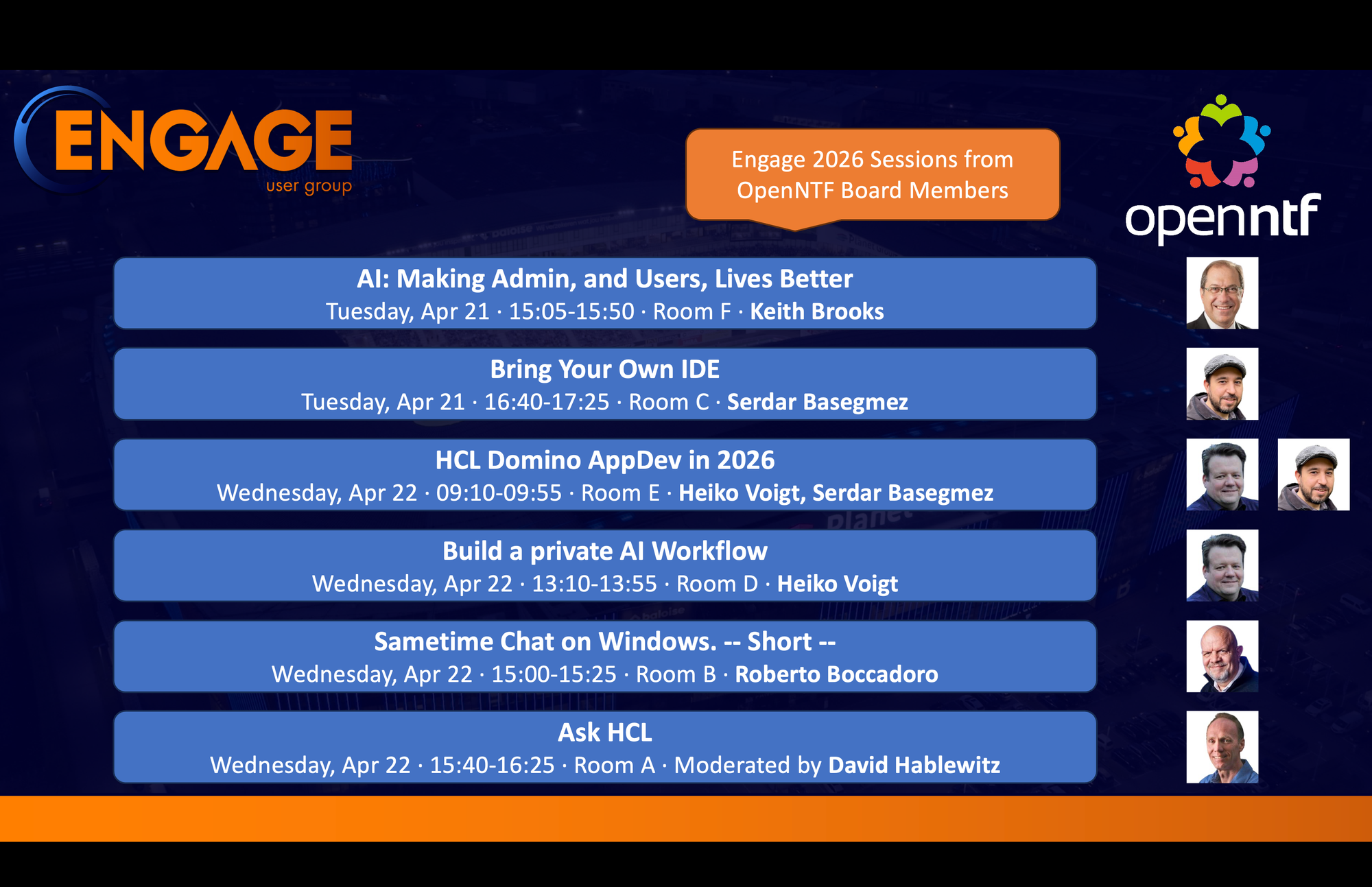 Also, I have the great honor to be speaking at two sessions - but let me move the focus on our joint efforts of OpenNTF - the Open Source Community around the HCL Digital Solutions portfolio. This pictures shows the content, that we and the board are delivering at Engage - I tip my hat for the enthusiasm and proficiency my colleagues at board are bringing to the table.