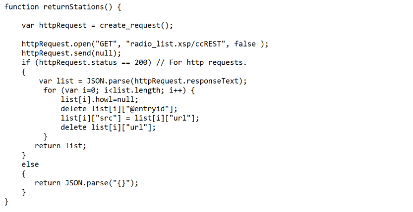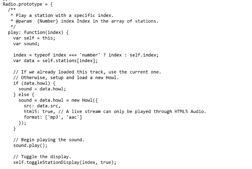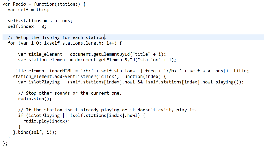 We then have a script block derived from the Howler Sample code that reads the stations and adds the click logic and interactions to it: